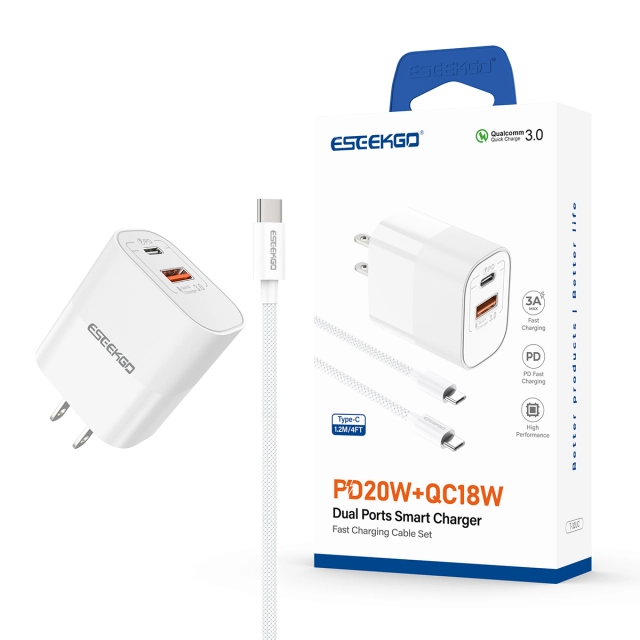 ESEEKGO T-32UC Fireproof PC Travel Adapter With 4FT Type-C To Type-C Fast Charging Cable(20W / US / 2 Ports)