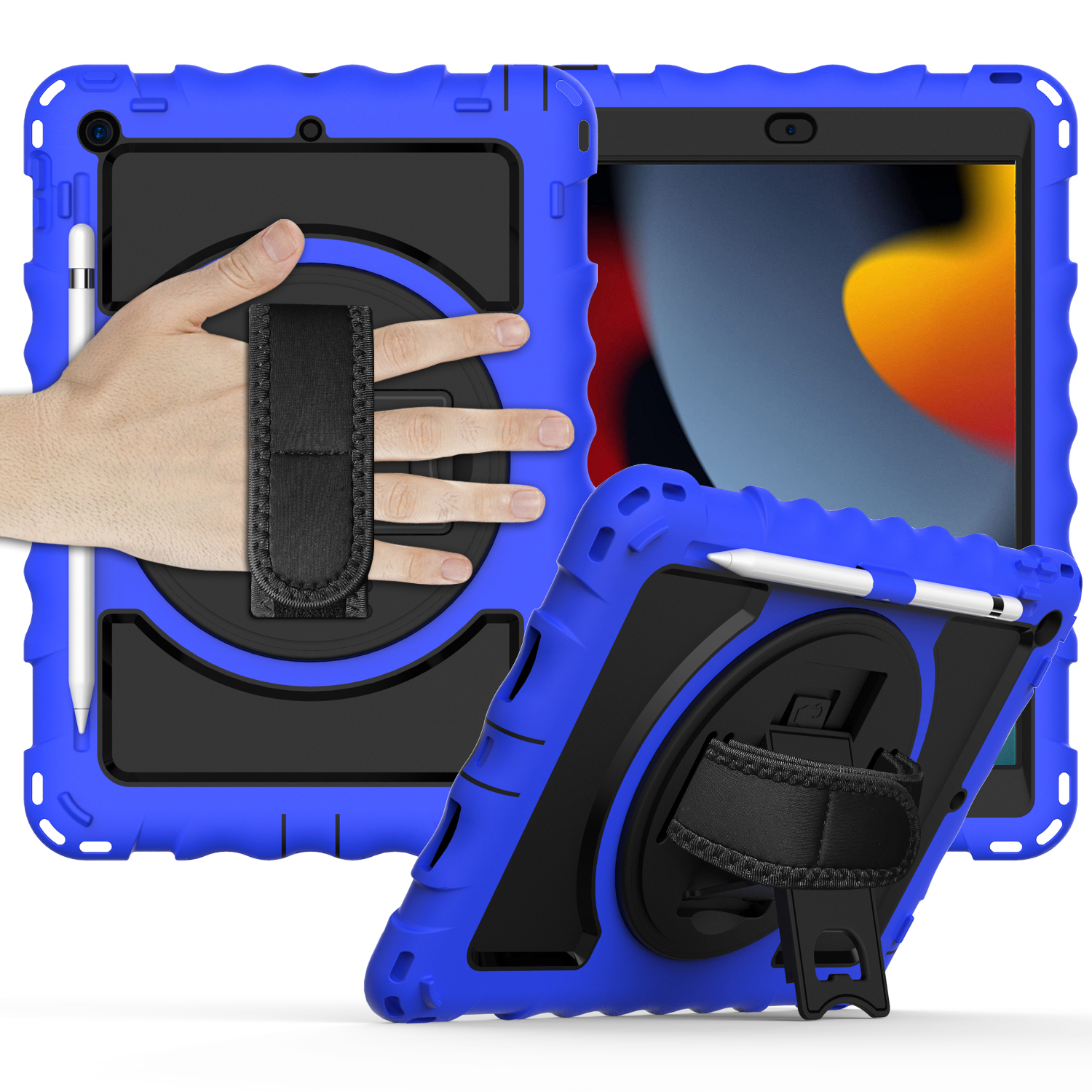 iPad 7/8/9 10.2" Tablet Complete 360 Tough Hybrid Kickstand With Shoulder Hand Strap - Dark Blue