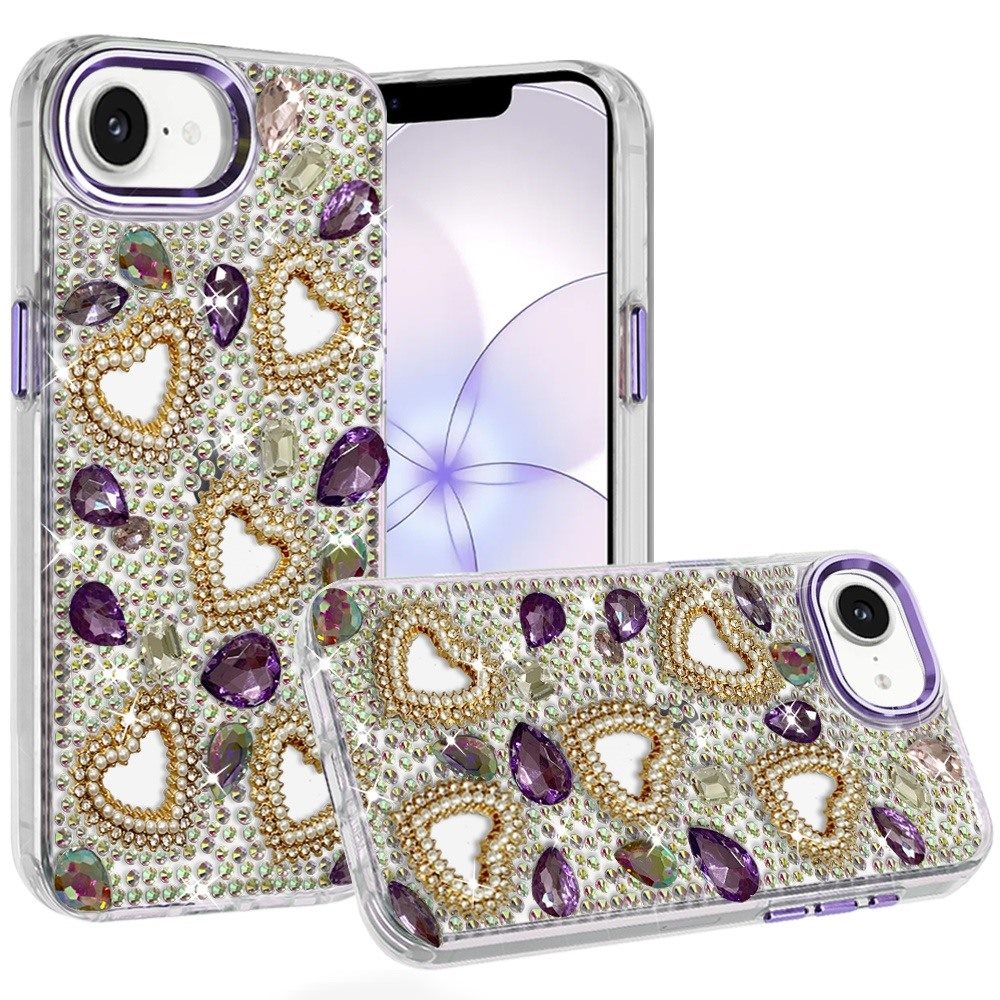 For iPhone 16E (E edition) / SE4 (2025) Luxury Crystal Heart Rhinestones Diamond Bling Hybrid Case - Dark Purple