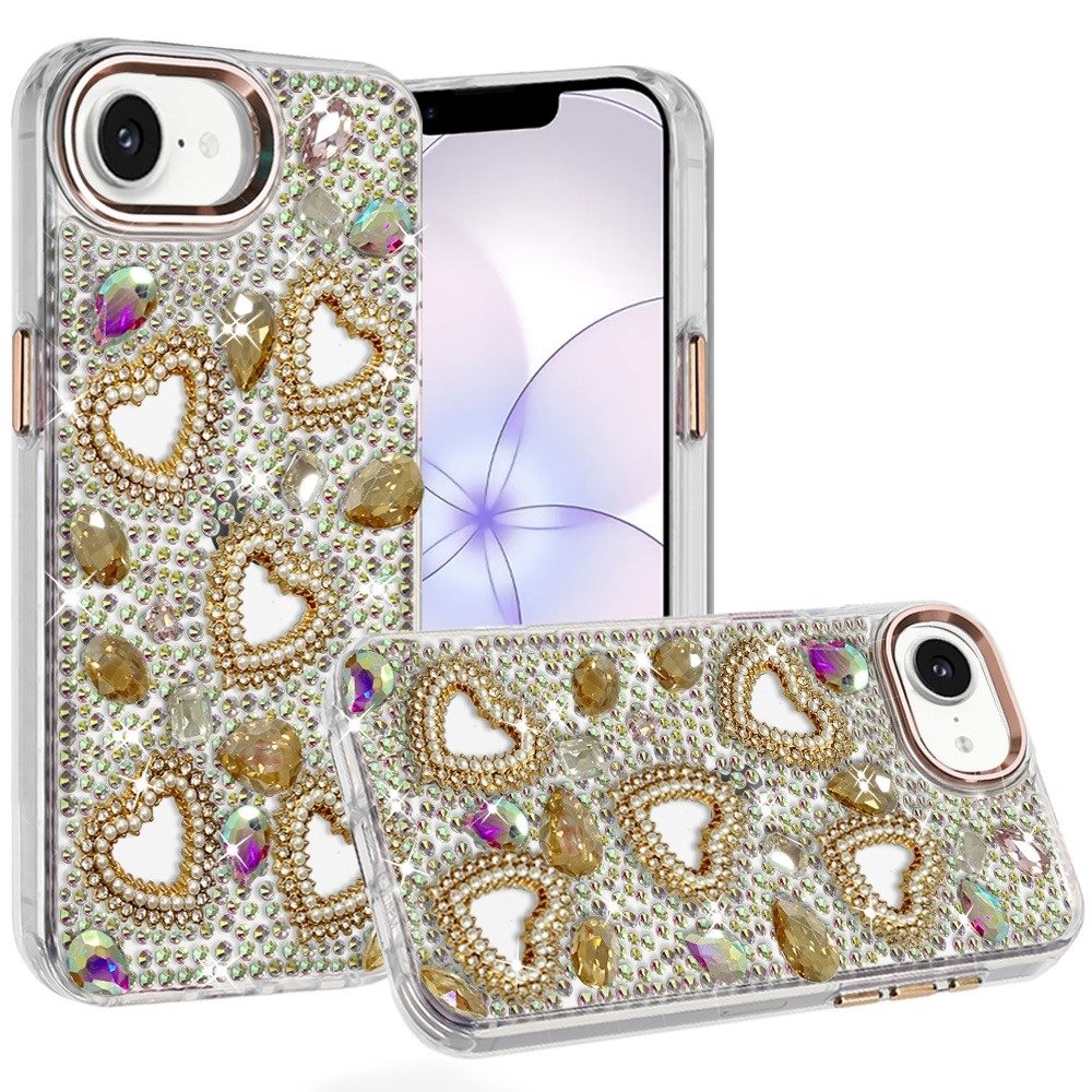 For iPhone 16E (E edition) / SE4 (2025) Luxury Crystal Heart Rhinestones Diamond Bling Hybrid Case - Gold
