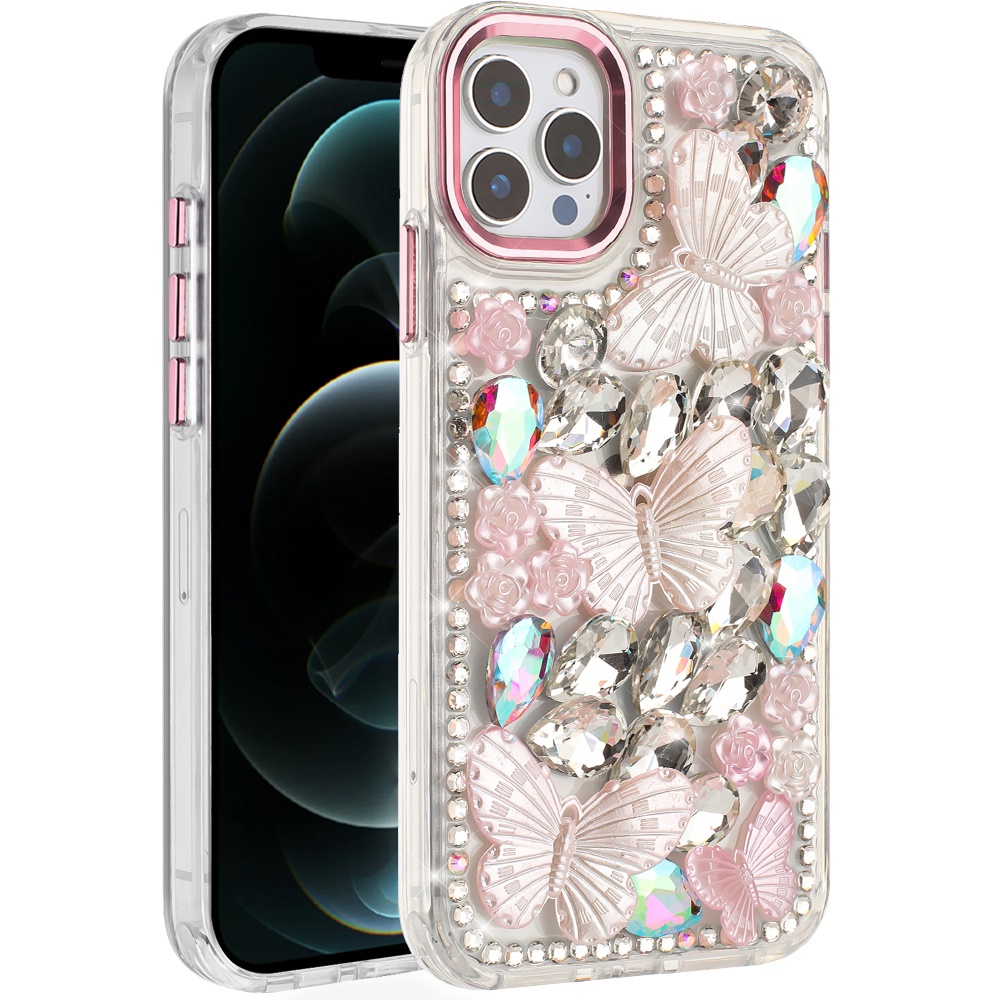 For iPhone 17 Pro Max Lavished Floral Butterfly Bling Stones Hybrid Case - Pink