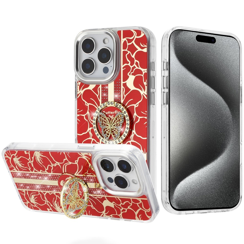 For iPhone 17 Splendid Floral Designs with Metal Camera and Buttons with Butterfly Ring Stand Hybrid Case - Red