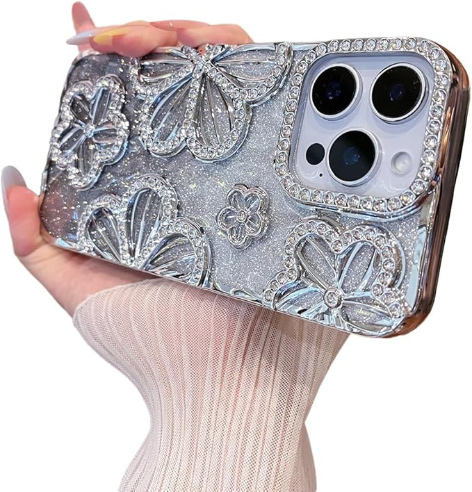 For iPhone 17 Pro Shimmer Glitter Floral Design Thick TPU Case Cover - Silver