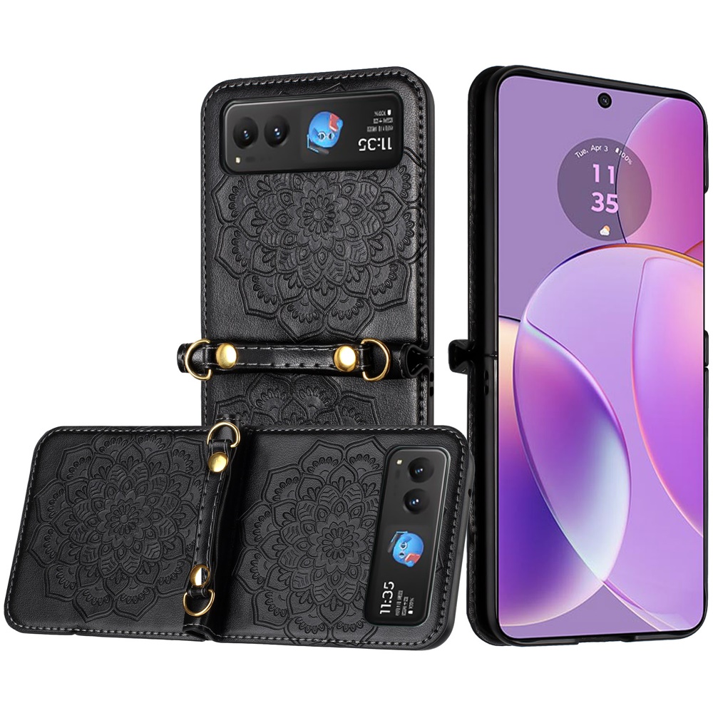 For Motorola Razr 2025 2024 METKASE Embossed Floral Design Case Cover with Strap in Slide-Out Package - Black