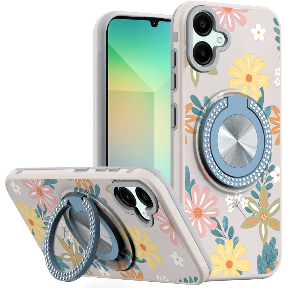 For Samsung A06 Metal Diamond CD Pattern Design Matte Finished Hybrid with Rotational Ring Case - Floral E