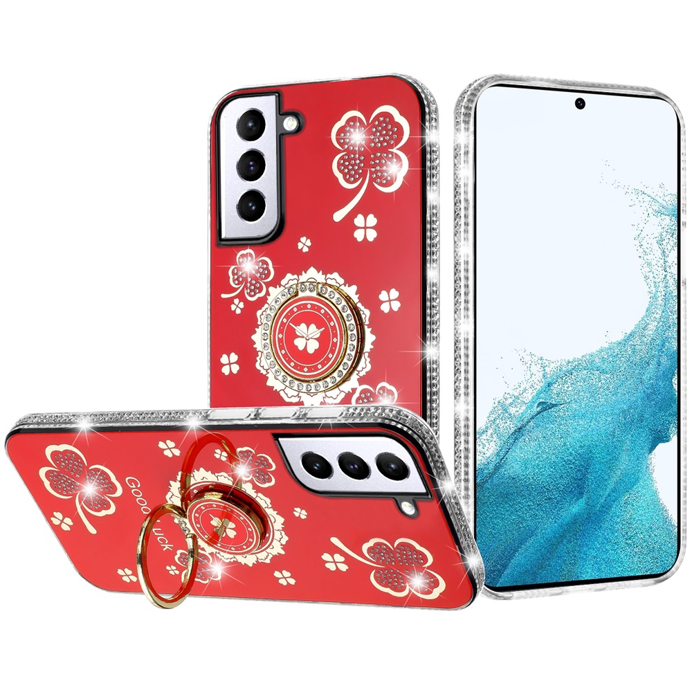 For Samsung Galaxy S22 Ultra Splendid Glitter with Diamonds All Around Edges Ring Stand - Red