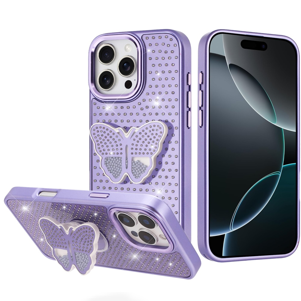 iPhone 16 Pro Max 6.9 Butterfly Moveable Grip Stand With Small Diamonds Meta Buttons HQ Hybrid - Purple