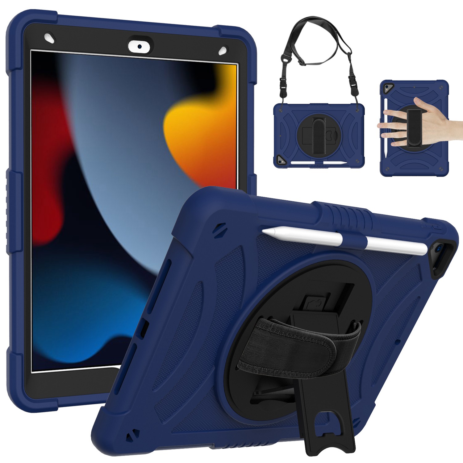 For Apple iPad 9th 8th 7th Gen 10.2 inch Tablet Hand and Shoulder Strap with Kickstand 3in1 Tough Hybrid - Dark Blue