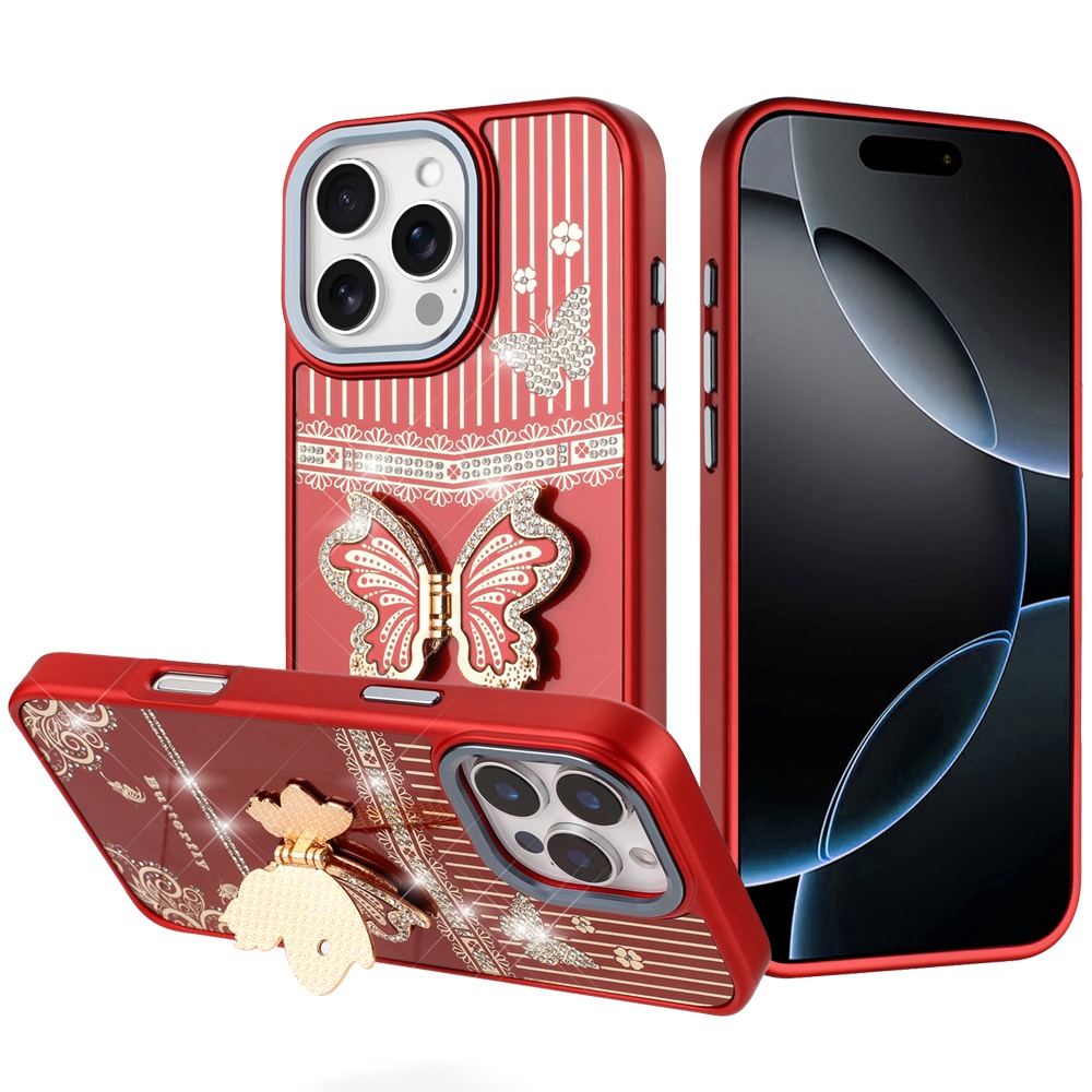 Samsung A17 5G Splendid Glitter Butterfly Design Stand with Metallic Edges Hybrid Case - Red