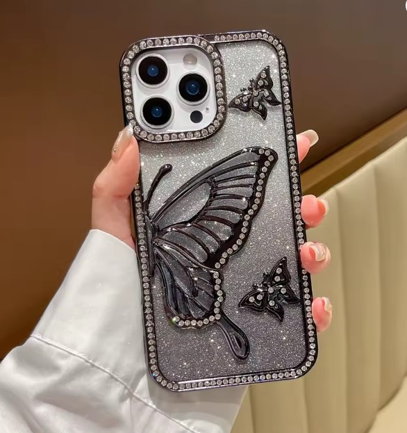 SIDE BUTTERFLY DIAMOND CASE (WITH RETAIL BOX) FOR IPHONE 13/14/15 | BLACK