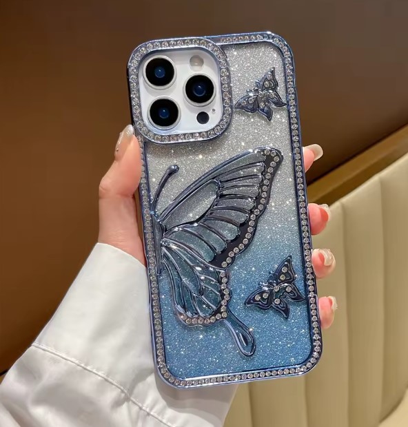 SIDE BUTTERFLY DIAMOND CASE (WITH RETAIL BOX) FOR IPHONE 13/14/15 | BLUE