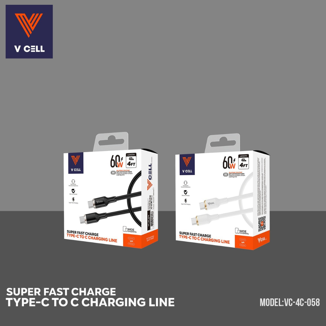 VC-4C-058 V CELL TYPE C TO C CABLE 4FT BLACK / WHITE SUPER FAST CHARGING 60W WITH RETAIL PACKING