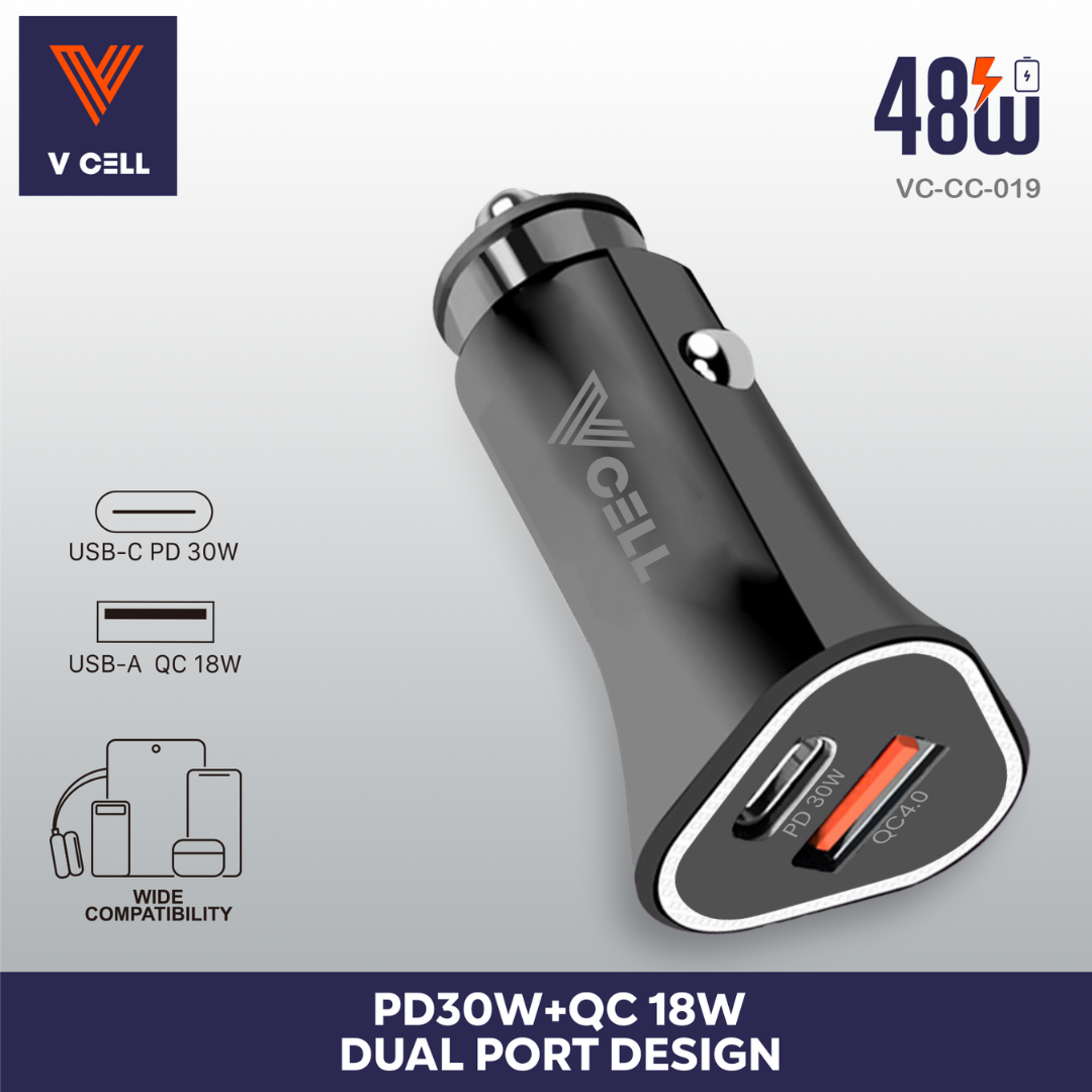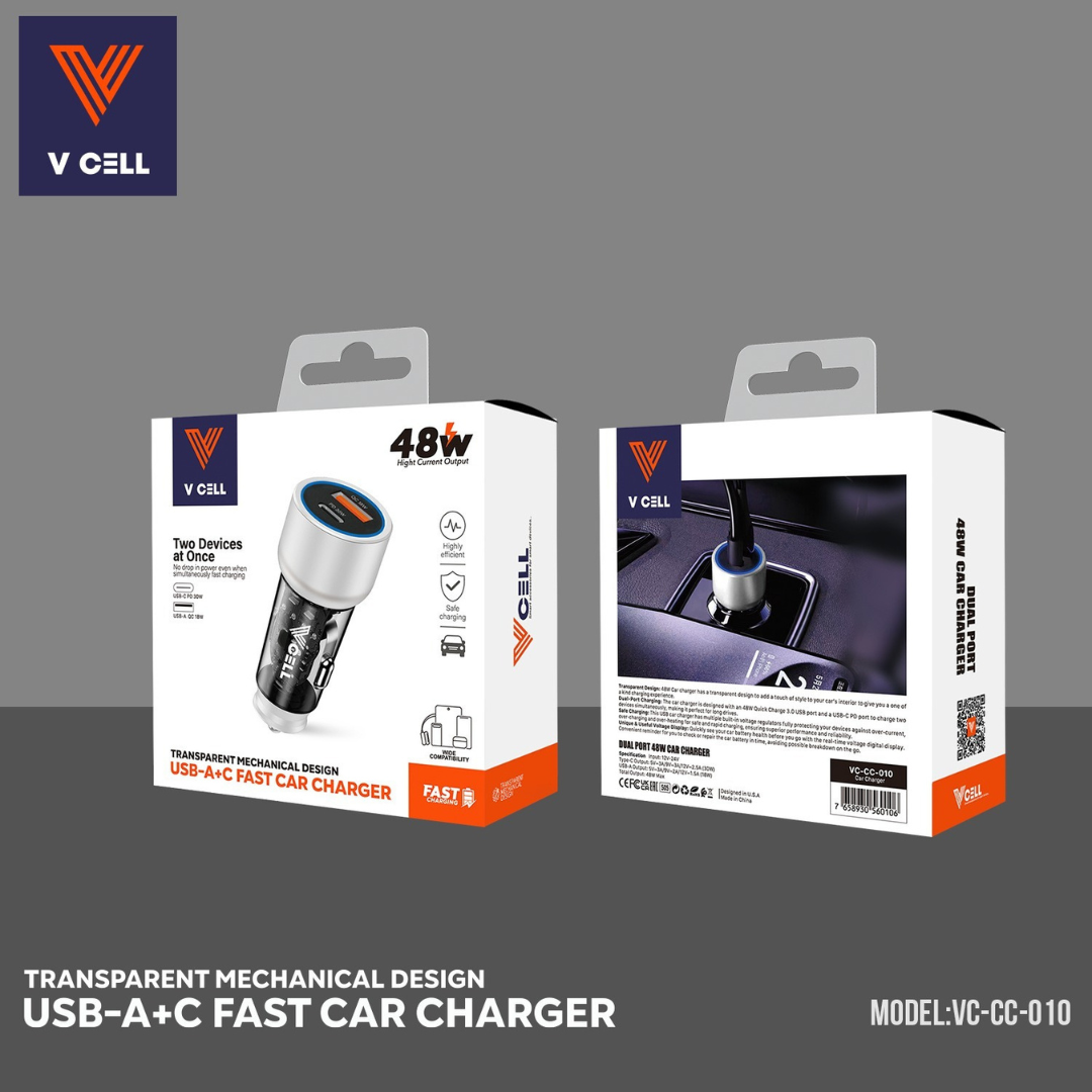 VC-CC-010 V CELL CAR CHARGER 48W A+C FAST CAR CHARGER WITH RETAIL PACKING