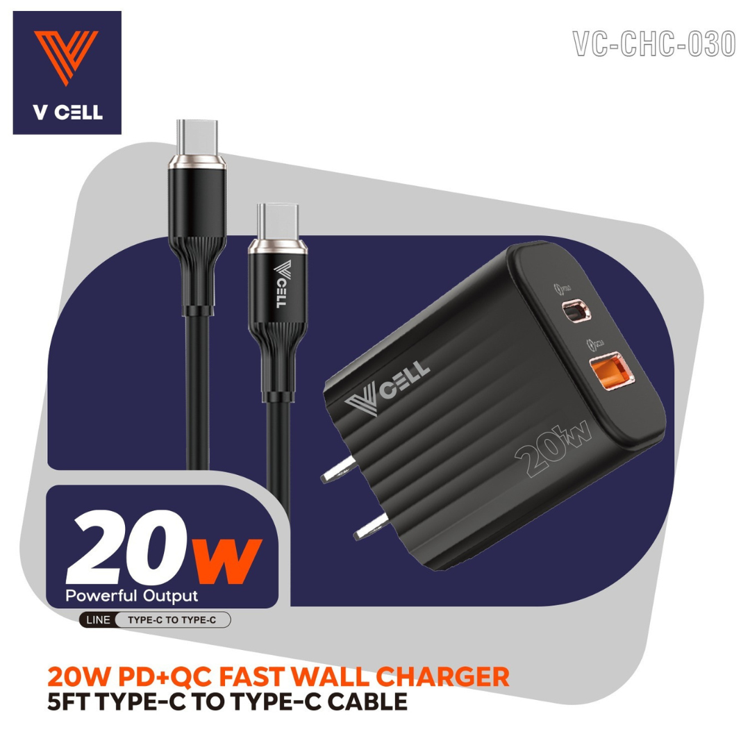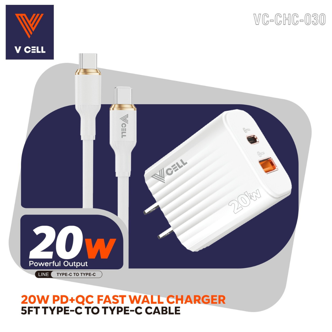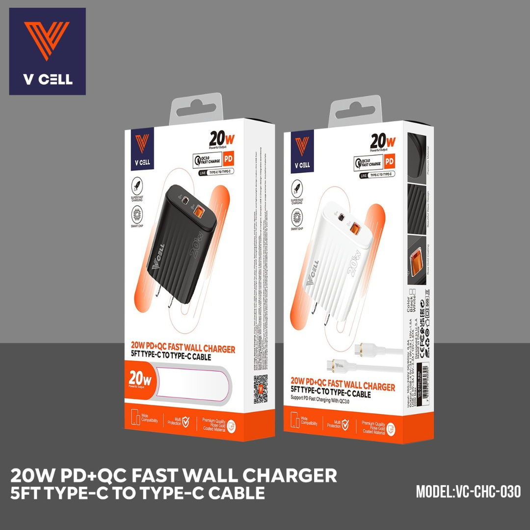 VC-CHC-030 V CELL 20W PD/QC WALL CHARGER & 5FT CABLE C TO C WITH RETAIL PACKING